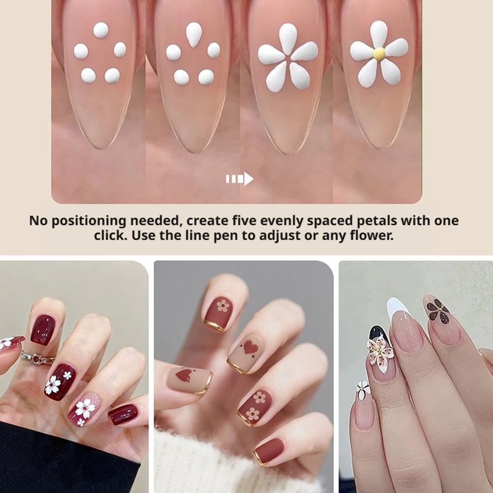 Revolutionize your nail decoration with this innovative dotting tool. It features five precisely spaced metal tips, each 1.8mm in diameter, allowing you to instantly create perfect five-petal flower designs with a single, simple press. Achieve stunning floral patterns on your nails with incredible ease and speed.
